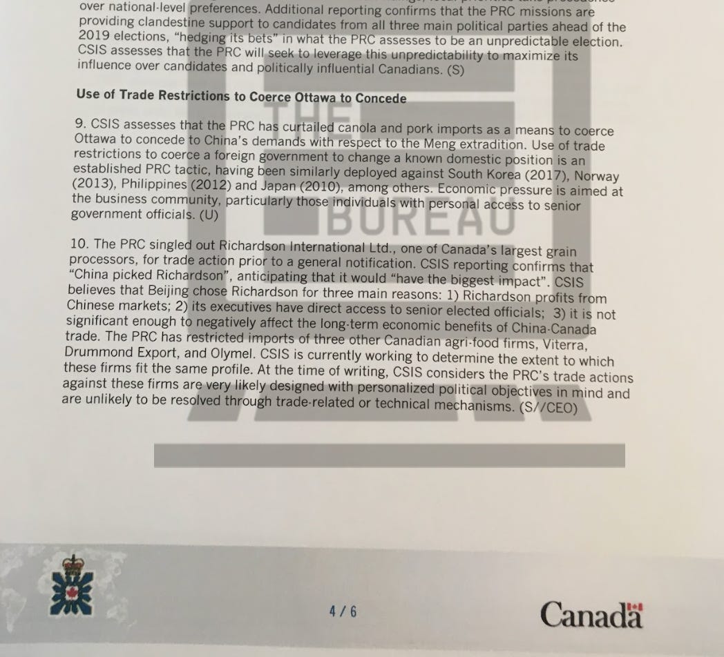 “The PRC singled out Richardson International Ltd.,” the document states, adding that “CSIS reporting confirms that ‘China picked Richardson’, anticipating that it would ‘have the biggest impact’.”