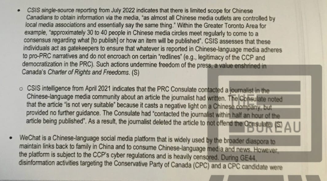 The Bureau has obtained and confirmed a CSIS intelligence assessment dated October 31, 2022, marked SECRET//CANADIAN EYES ONLY, providing devastating detail about Chinese control of media in Canada—a portion of which is posted in the headline photo for this opinion editorial.