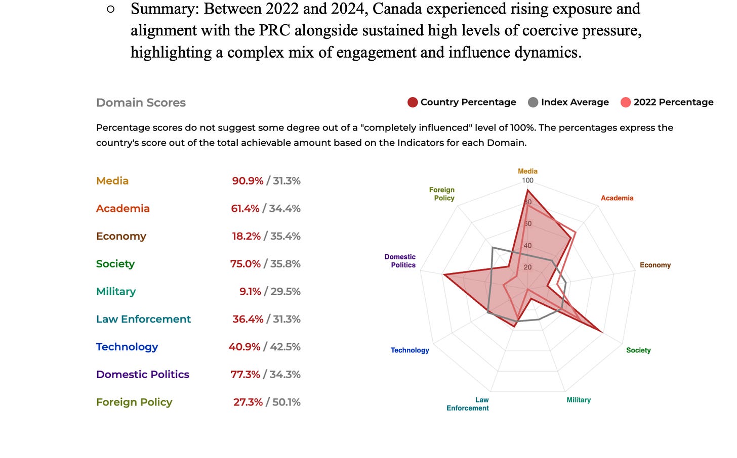 Domestic politics influence jumped 54.6 percent as intelligence confirmed PRC meddling in Canada’s 2019 and 2021 elections, while a media score of 90.9 percent drives Beijing narrative controls.
