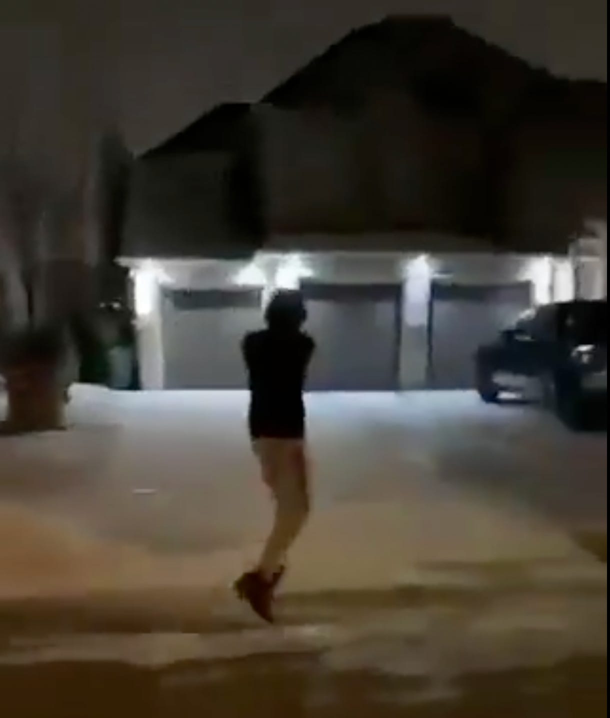 The footage shows a slim individual wearing a dark hoodie and light-colored track pants awkwardly jogging toward a large suburban home with a three-car garage and a black truck parked in the driveway. The person stops near the driveway, extends their arm, and appears to fire about eight shots; muzzle flashes are visible during the firing sequence. The clip appears to be filmed from inside a vehicle with a shaky, handheld phone camera.