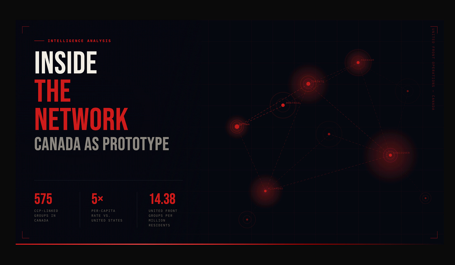 On civil society capture: the 575 groups identified in Canada span community associations, business chambers, cultural organizations, and student networks — the precise connective tissue through which, as Liu argues, the CCP embeds influence at every level of democratic society before institutions even recognize the threat.