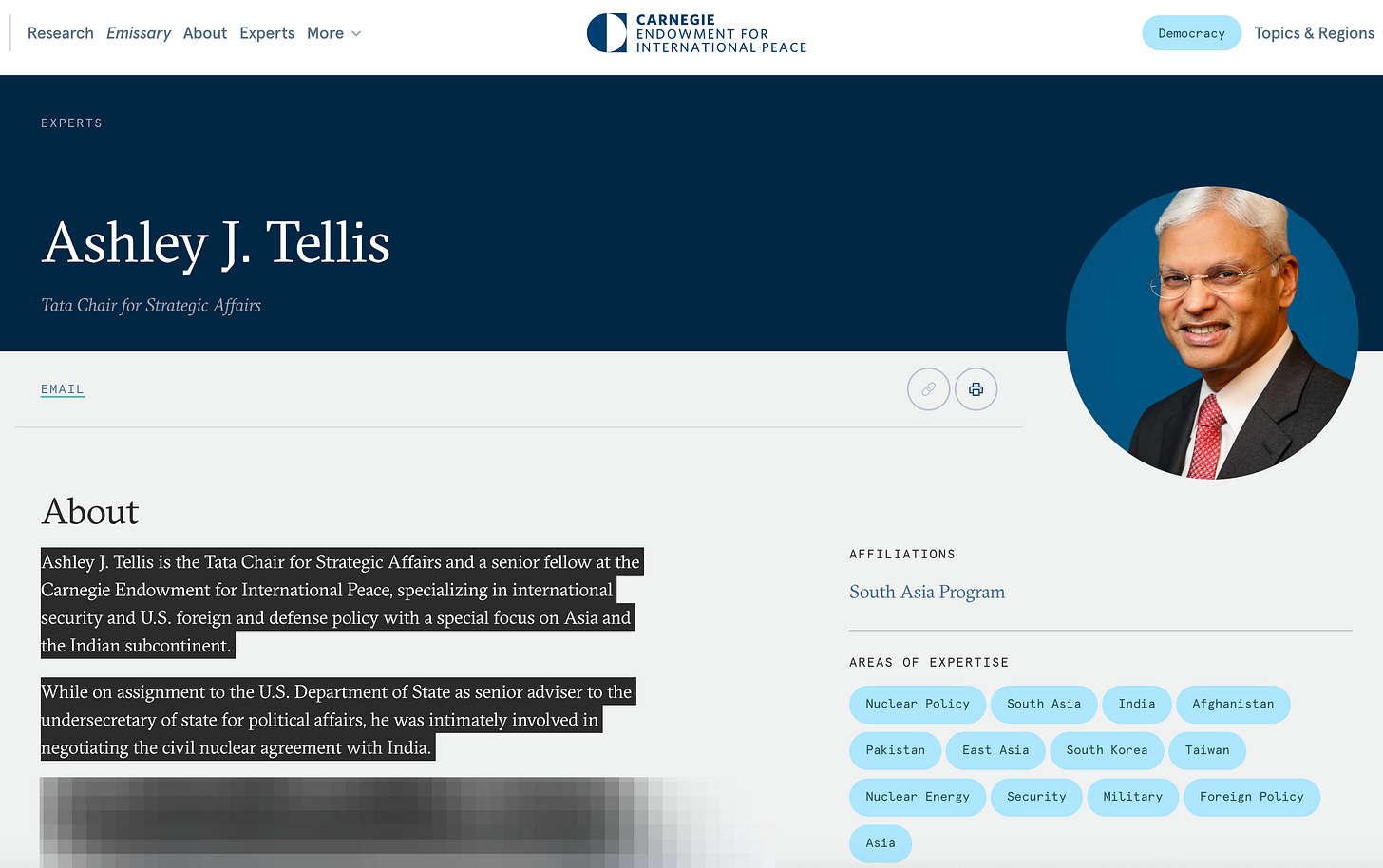 “Ashley Tellis is one of the most well-respected experts on India and U.S.–India ties in Washington,” The Economist’s defense editor Shashank Joshi wrote on X yesterday. “This will really shock the think-tank community.”