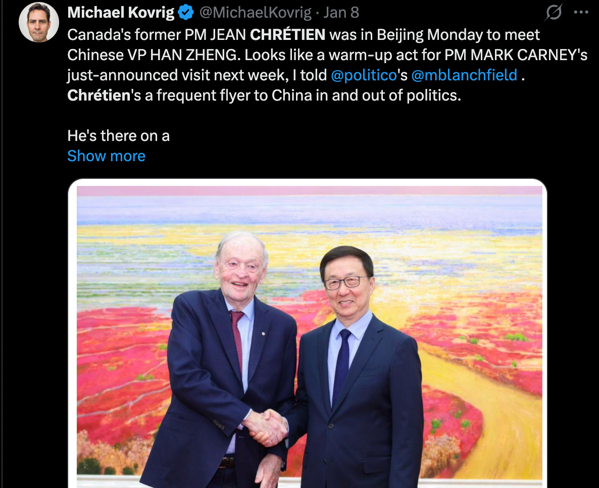 Kovrig notes that former Prime Minister Jean Chrétien was in Beijing to meet Chinese Vice President Han Zheng just days before Carney’s scheduled arrival — in what Kovrig described as a possible “warm-up act” ahead of Ottawa’s official mission.