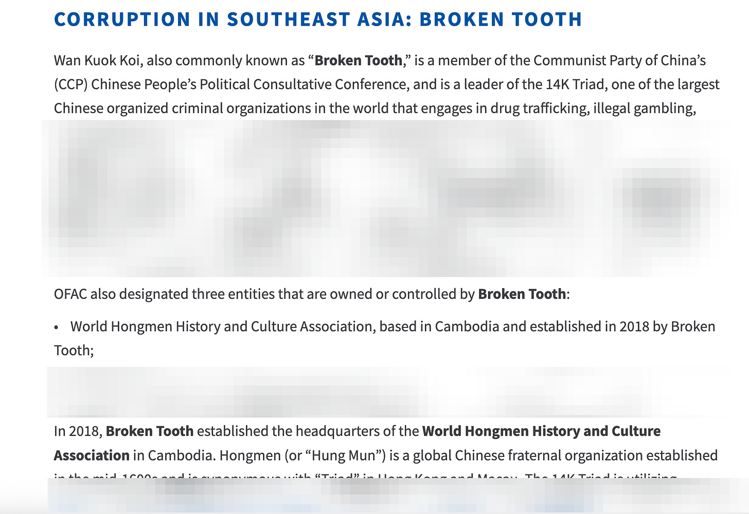 It notes how former 14K triad boss Wan Kuok-koi, also known as “Broken Tooth,” rose from Macau underworld infamy to become president of the World Hongmen History and Culture Association. His record includes leading the 14K triad through a bloody Macau casino-lending turf war in the mid-1990s.
