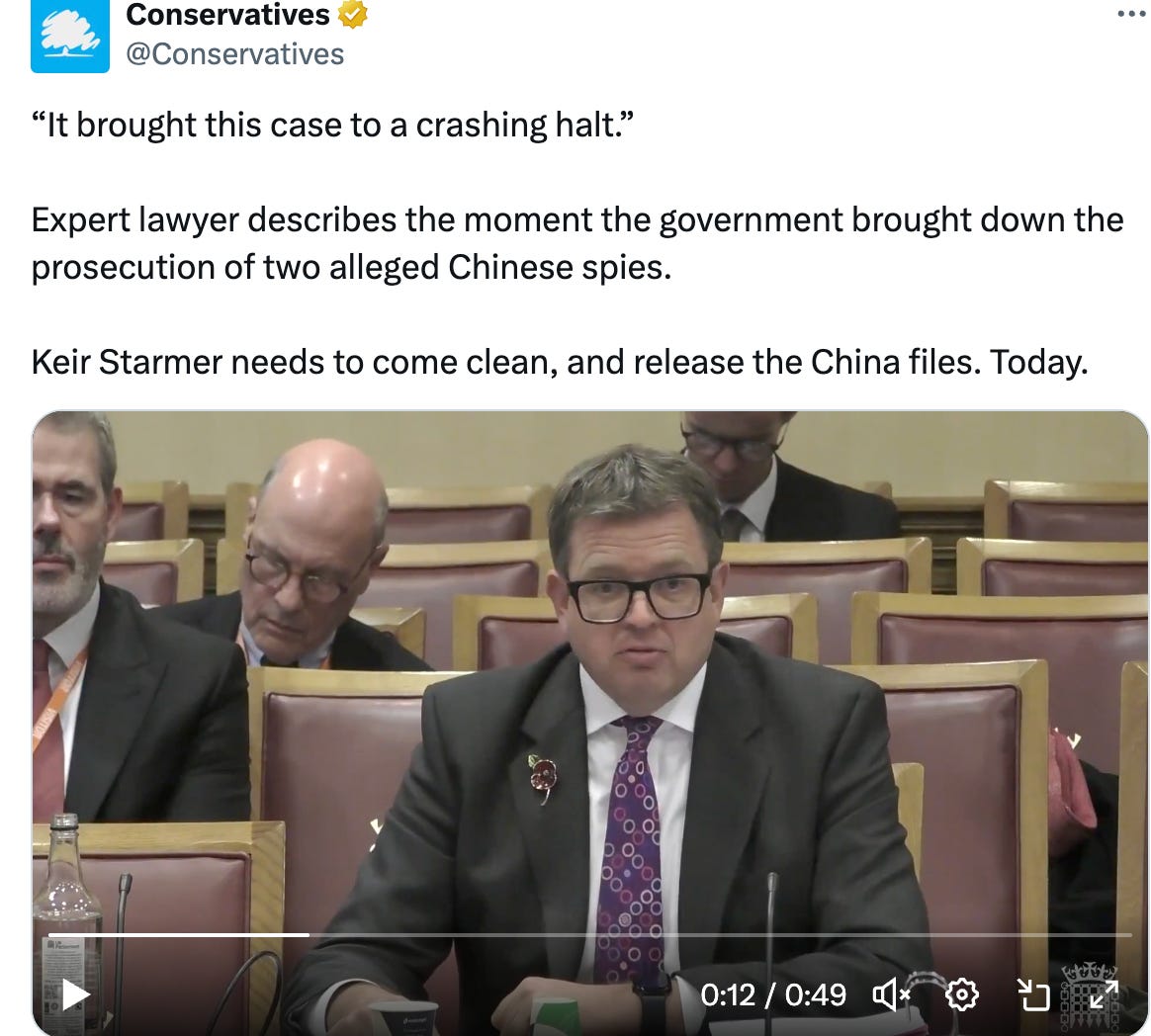 “The witness (National Security Adviser Matthew Collins) was clear to me that he would not say that China posed an active threat,” lead prosecutor Tom Little KC testified to British lawmakers. “Once he had said that, the current prosecution for those charges was effectively unsustainable. It brought this case to a crashing halt.”