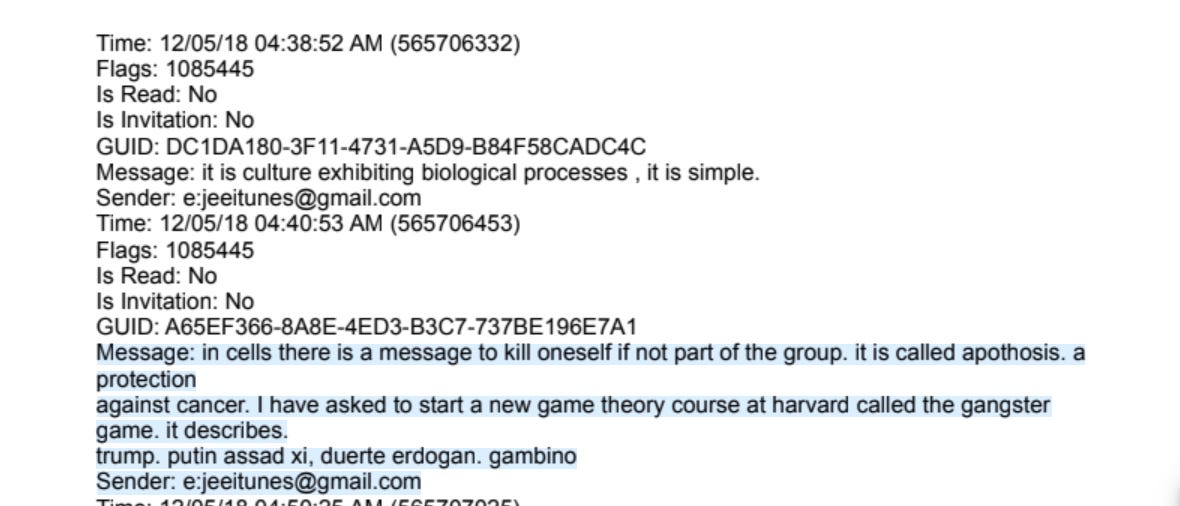 Earlier in that exchange, another striking line from Epstein shows how he viewed a roster of world leaders: “I have asked to start a new game theory course at harvard called the gangster / game. it describes. / trump. putin assad xi, duerte erdogan. gambino.”