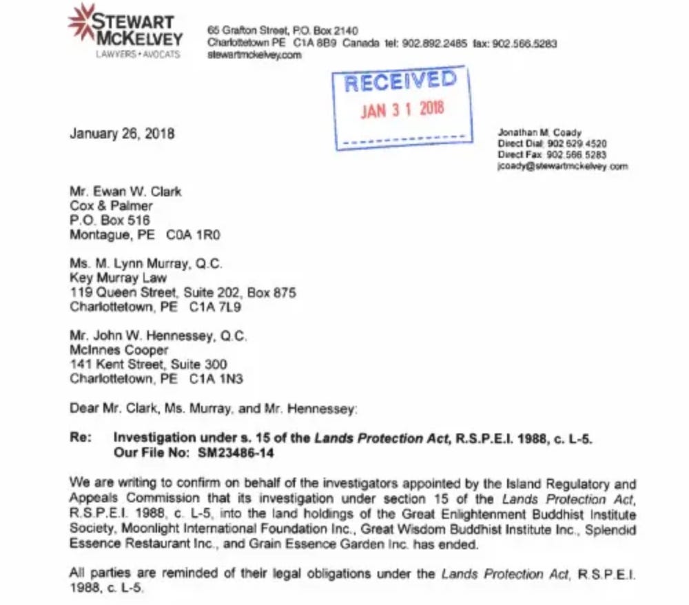 Documents reviewed by The Bureau show that the decade-old investigation, authorized under section 15 of PEI’s Lands Protection Act, examined land holdings of several Buddhist-affiliated corporations — including the Great Enlightenment Buddhist Institute Society, Great Wisdom Buddhist Institute Inc., Moonlight International Foundation, and related companies — before being declared concluded in January 2018. No findings were ever made public.