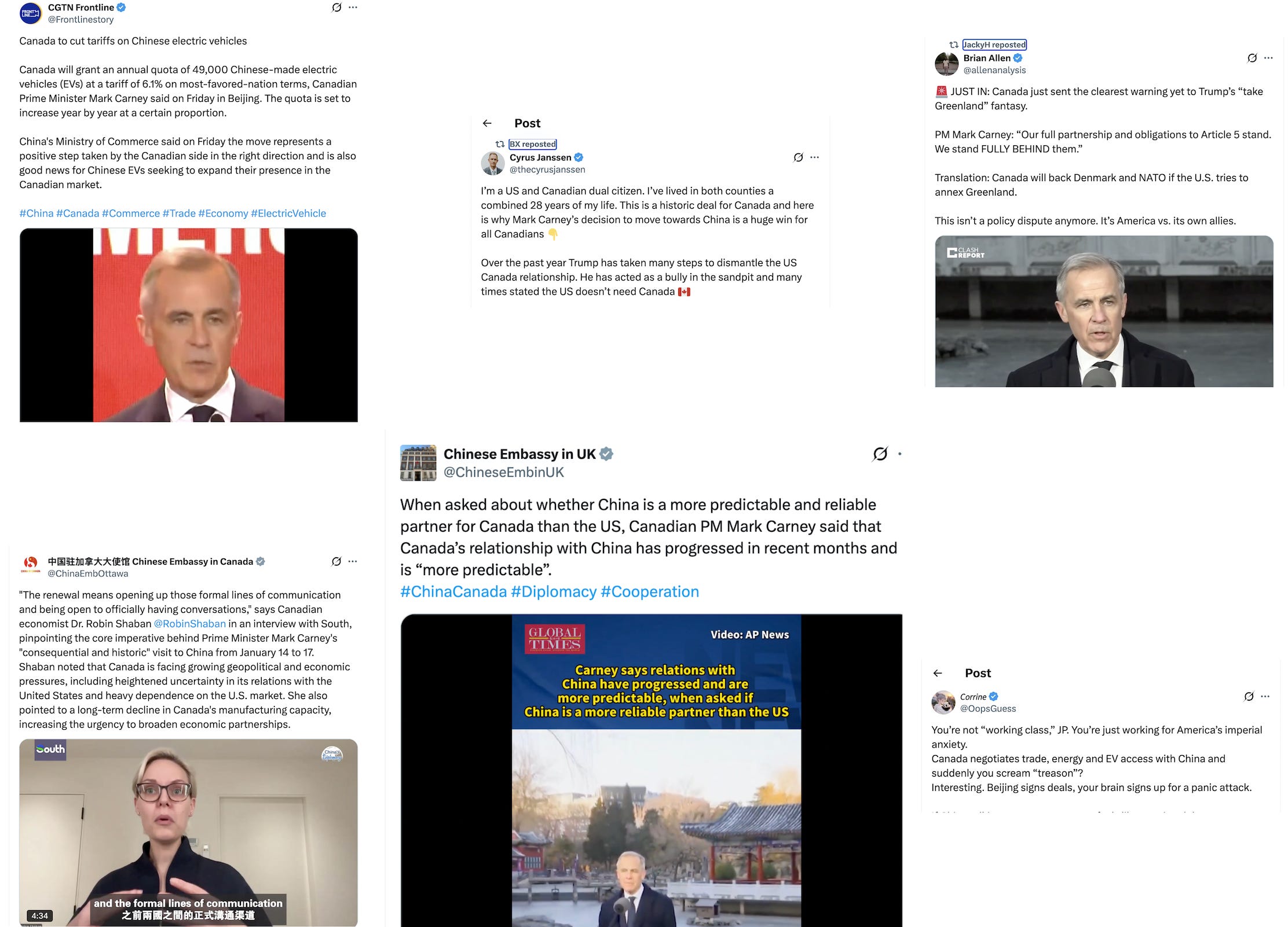 Graphika reports that the Chinese Embassy in Canada posted footage on X from an interview with a Canadian economist arguing that improved ties with China may offset Canada’s “heavy dependence on the U.S. market.” Other Chinese embassies posted clips of Carney describing the China–Canada relationship as “more predictable” lately and praising a “new strategic partnership,” while the Chinese Embassy in the United States praised the partnership in a Facebook post.