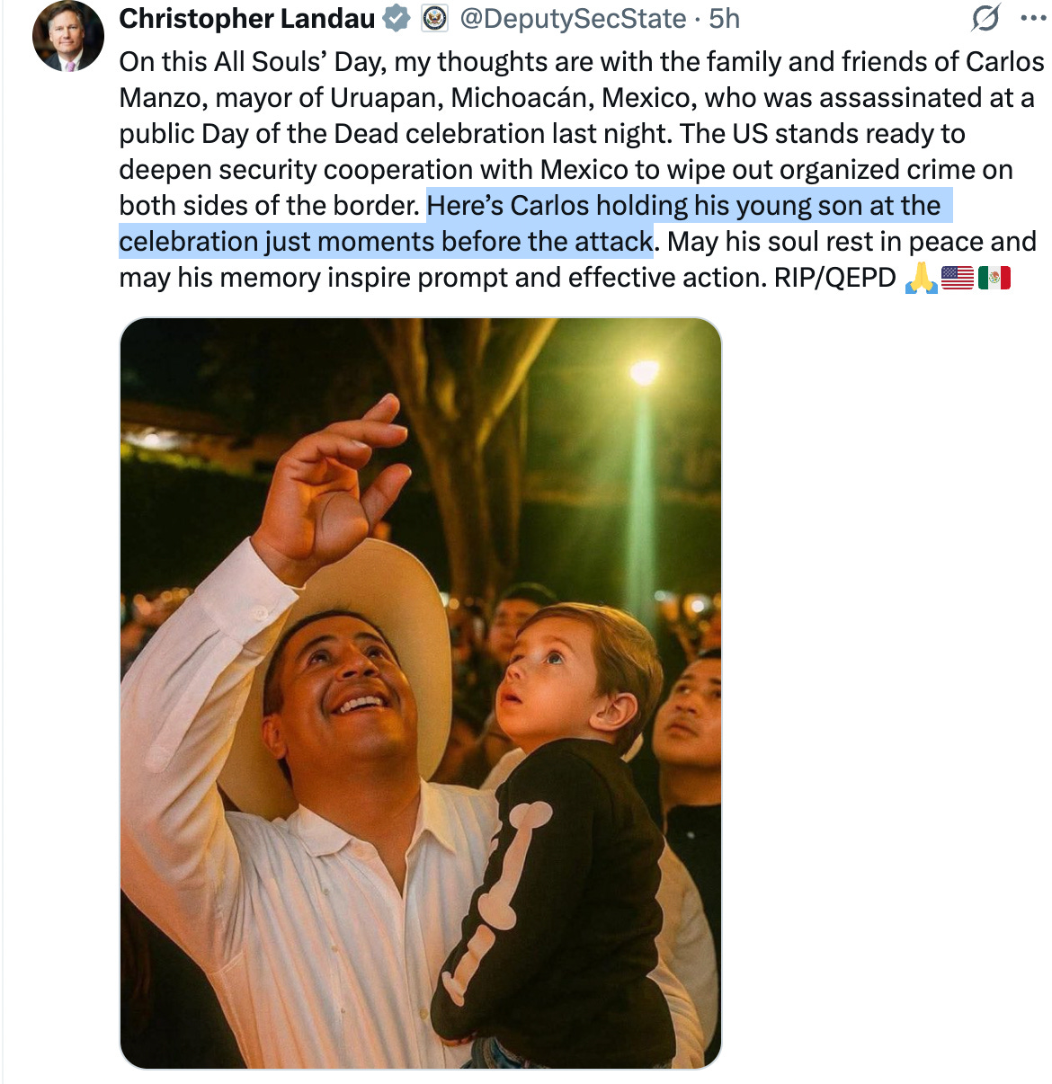 In Washington today, the killing drew political reaction. “My thoughts are with the family and friends of Carlos Manzo, mayor of Uruapan, Michoacán, Mexico, who was assassinated at a public Day of the Dead celebration last night. The United States stands ready to deepen security cooperation with Mexico to wipe out organized crime on both sides of the border,” Deputy Secretary of State Christopher Landau, the former U.S. ambassador to Mexico, said in a statement shared online.
